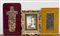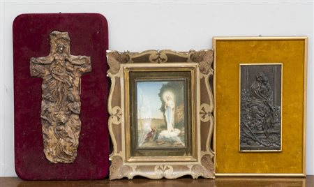 Lotto composto da un bassorilievo in creta su pannello raffigurante la crocifissione, un bassorilievo in bronzo su pannello raffigurante la Madonna con Bambino e una riproduzione con l'apparizione della Madonna di Lourdes in cornice (difetti)