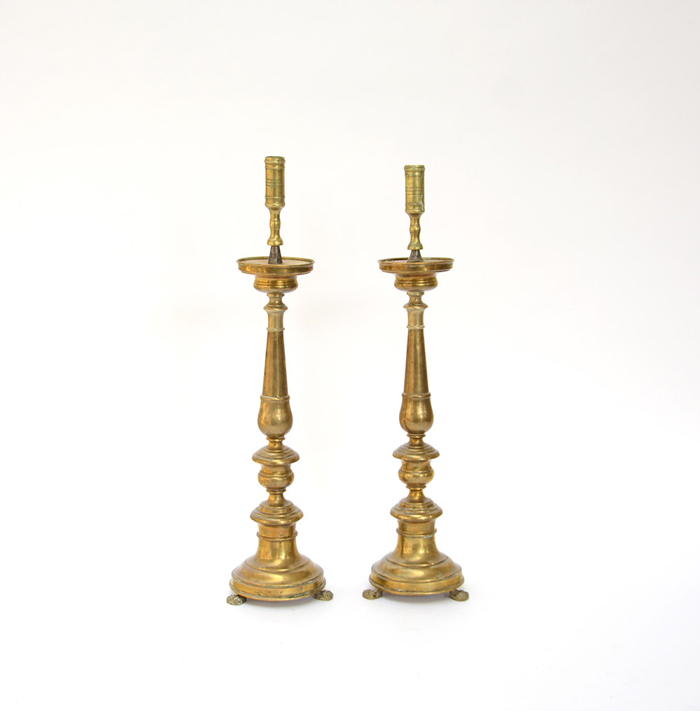 Coppia di portaceri in ottone con corpo tornito a fuso, sorretti da tre piedini a zampa ferina (h cm 40) (difetti)