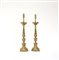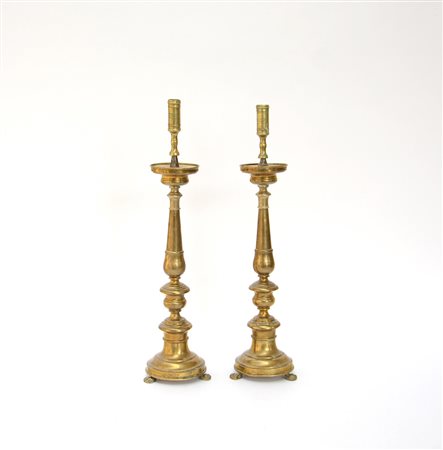 Coppia di portaceri in ottone con corpo tornito a fuso, sorretti da tre...