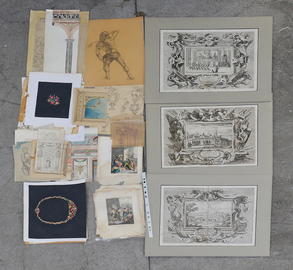 Lotto composto da numerosi disegni e incisioni, di soggetto differente (difetti)