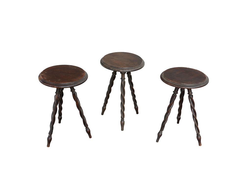 Gruppo di tre sgabelli con seduta tonda e gambe a torciglione terminanti con piedi torniti. Sec. XIX (difetti e restauri)