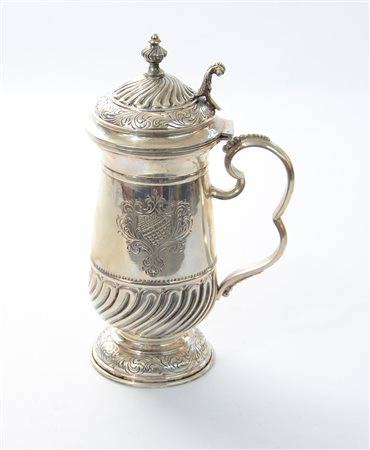 Tankard in argento con corpo a balaustro decorato con fasce baccellate e...