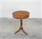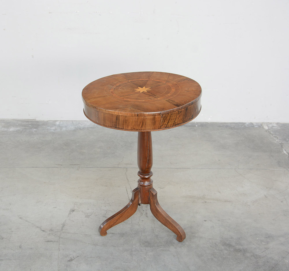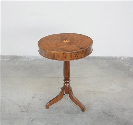 Tavolino da salotto lastronato in noce con piano filettato a motivi circolari con stella al centro. Gamba centrale a colonna terminante a tre piedi mossi. Sec. XIX (h. cm 70 x d. cm 52) (difetti e restauri)