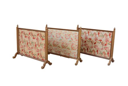 Gruppo di tre parascintille in legno dorato decorate da tessuto orientali a...