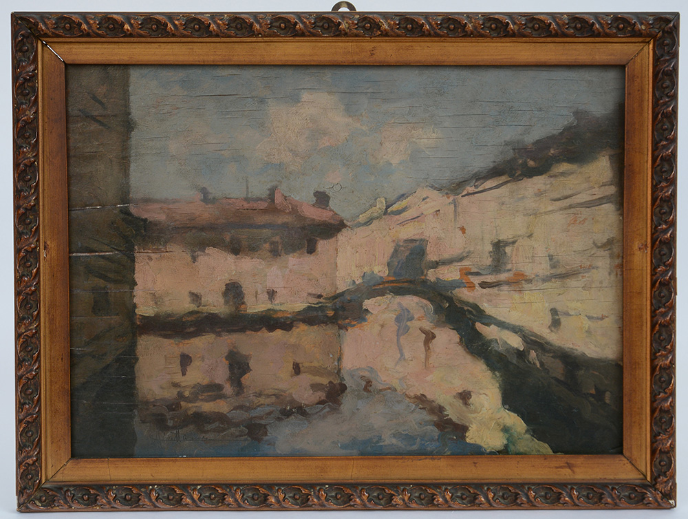 Achille Cattaneo Limbiate 1872 Milano 1931 "Palazzo Tantardini che si specchia nella conca di piazza San Marco"' olio su compensato (cm 34x48) firmato in basso a sinistra, in cornice (difetti)