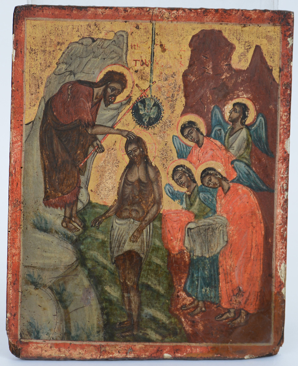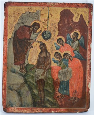 Icona russa raffigurante "Giovanni Battista che battezza Cristo fra gli angeli" (cm 30,5x24,5) (difetti)