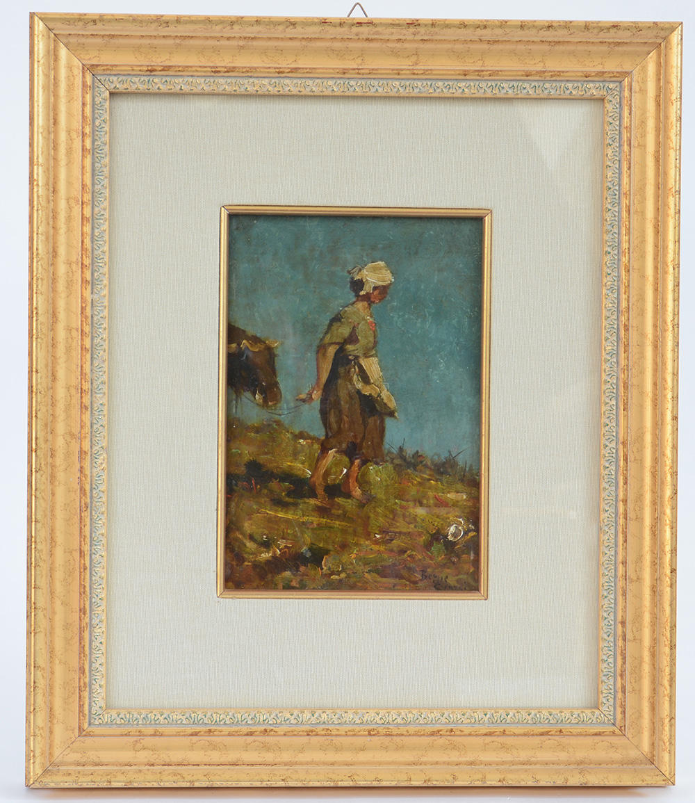 Ignoto, "Pastorella", olio su cartone (cm 23x16,5) firmato in basso a destra ed iscritto al verso: «Beppe Ciardi, particolare del quadro "Aratura sui monti" (studio)»; in cornice (lievi difetti)