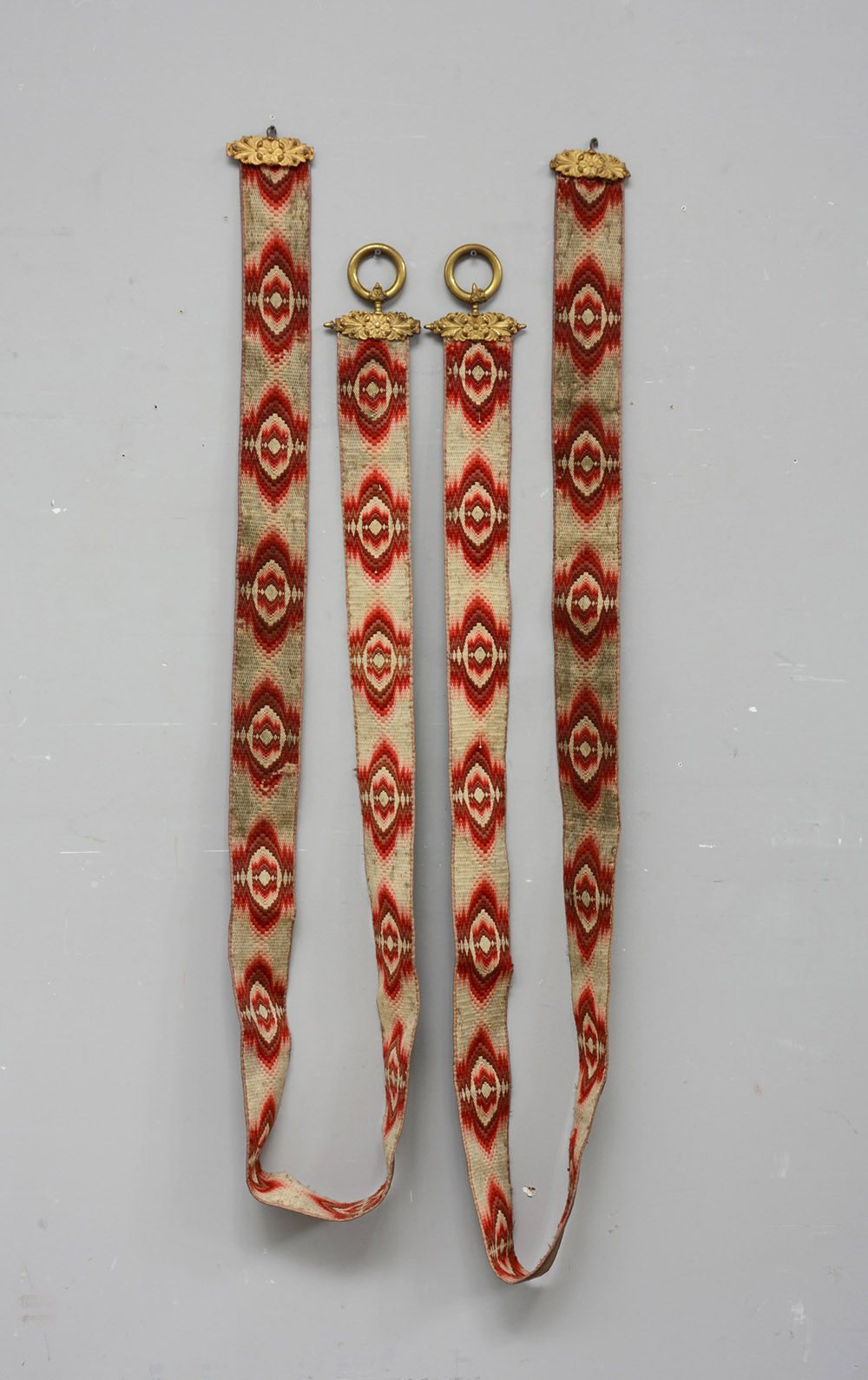 Coppia di tiracampanelli in tessuto a decoro geometrico con finale in ottone e bronzo. Sec. XIX (cm 240 ca.)