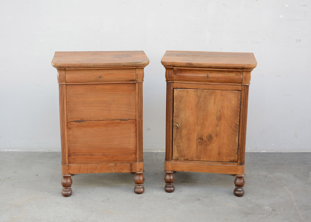 Comoda e comodino in noce ad un'anta e un cassetto con montanti scanalati e piedi torniti (cm 52x80x38) Sec. XIX