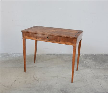 Scrittoio da centro ad un cassetto con piano intarsiato al centro da rosone e decorato da filetti in legni vari. Fascia ad un cassetto. Gambe rastremate. Sec. XVIII (cm 93x80x52) (difetti e restauri)