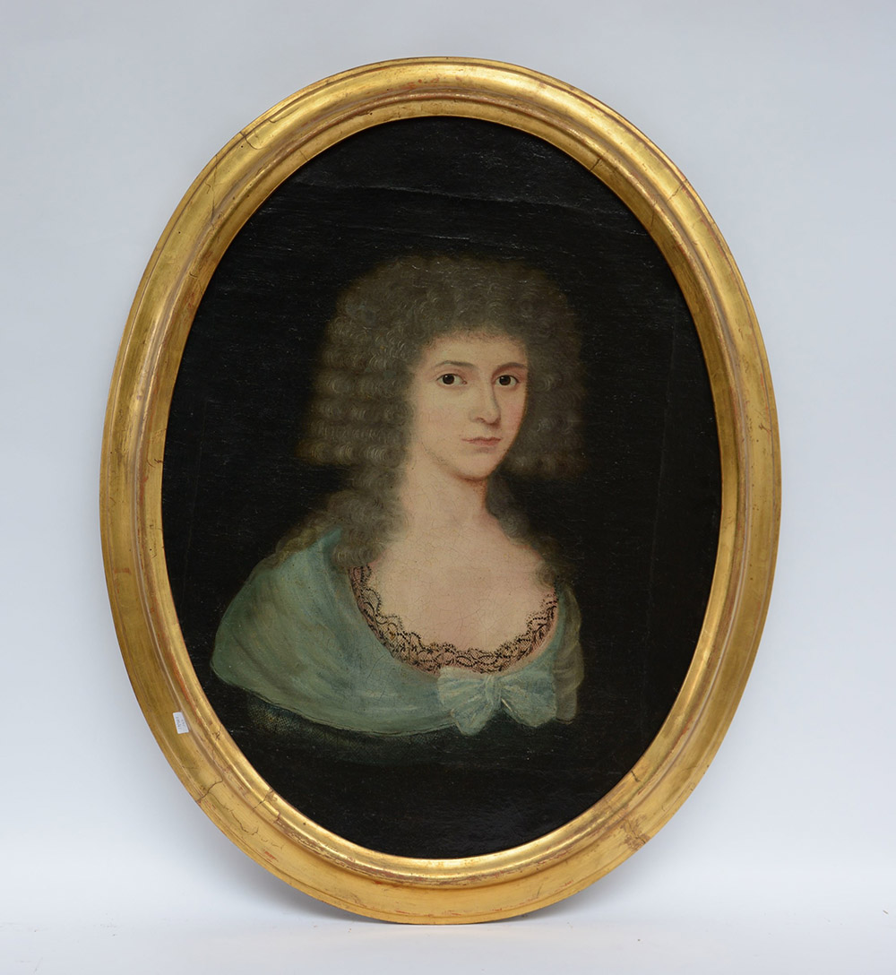 Scuola della fine del XVIII secolo "Ritratto di dama in abiti da camera" olio su tela ovale (cm78x60)