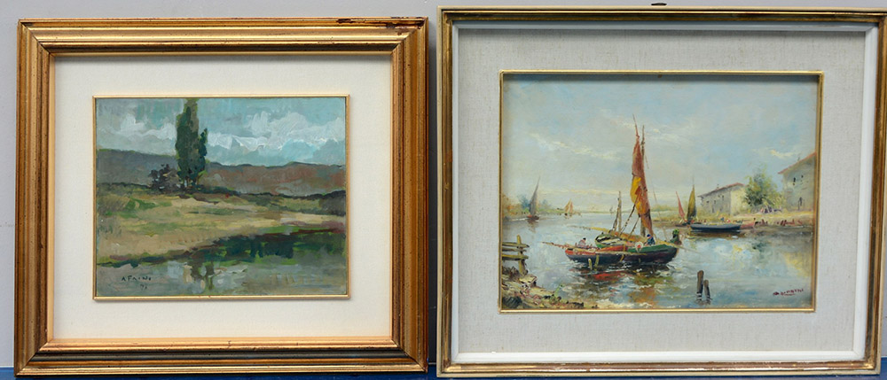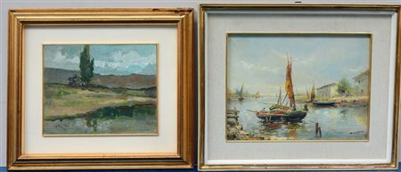 Lotto di due dipinti ad olio su cartone raffiguranti un paesaggio fluviale e uno marino, di autori differenti (cm 23x29 e 31x40), in cornici