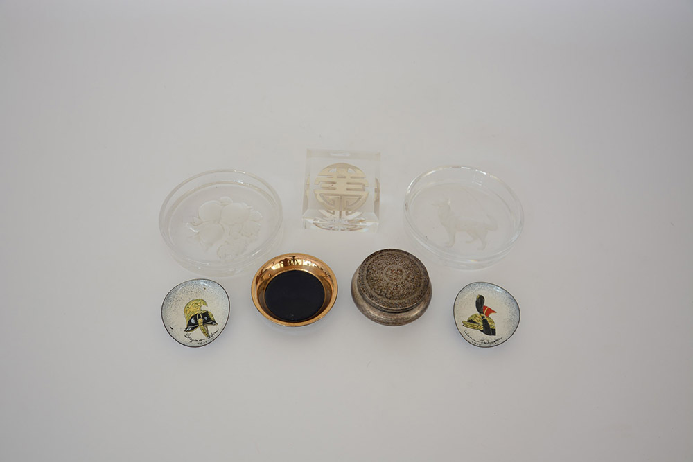 Lotto composto da cinque posacenere, una scatola e un fermacarte in metallo argentato, vetro e smalti (difetti)