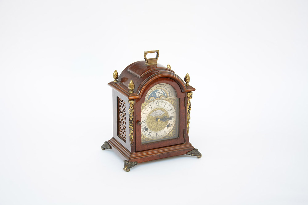 Orologio da tavolo con cassa in legno, quadrante in metallo (h. cm 25) (difetti)