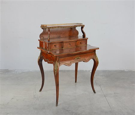 Mobile con alzata lastronato in bois de rose con parte superiore a due mensole con ringhiera in metallo dorato e tre cassetti. Parte inferiore a un cassetto sottopiano. Gambe mosse decorate con applicazioni in metallo dorato (cm 77x107x52) (difetti)