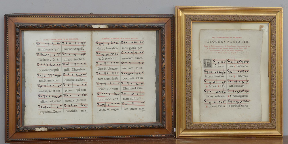 Lotto composto da una pagina doppia e una singola di antifonari, in cornici (difetti)