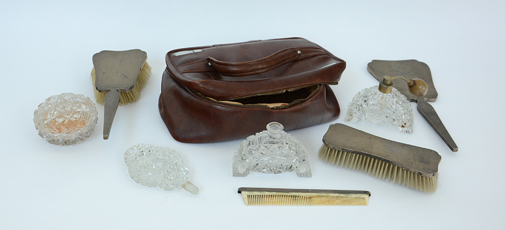 Servizio da toeletta in vetro e lamina d'argento composto da due spazzole, un pettine, uno specchio a mano un contenitore con coperchio e due portaprofumi, inizio sec. XX (difetti)