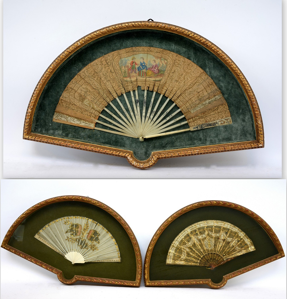 Lotto composto da tre ventagli con pagine in stoffa e carta di epoche diverse (difetti)