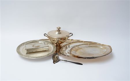Lotto composto da tre vassoi ovali e uno tondo, un colino, una zuppiera e un cofanetto in metallo argentato (difetti)