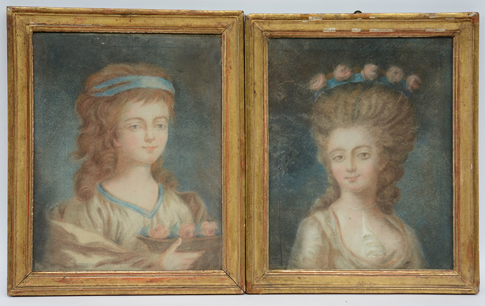 Scuola francese del secolo XVIII "Coppia di ritratti di donna" pastelli su carta (cm 40x32) In cornice (difetti)
