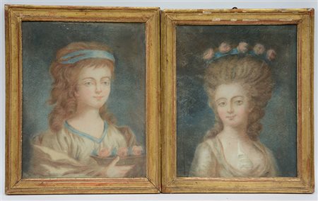 Scuola francese del secolo XVIII "Coppia di ritratti di donna" pastelli su...