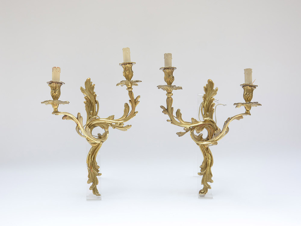 Coppia di applique a due luci in bronzo dorato con decoro fogliaceo (h cm 44 ca)