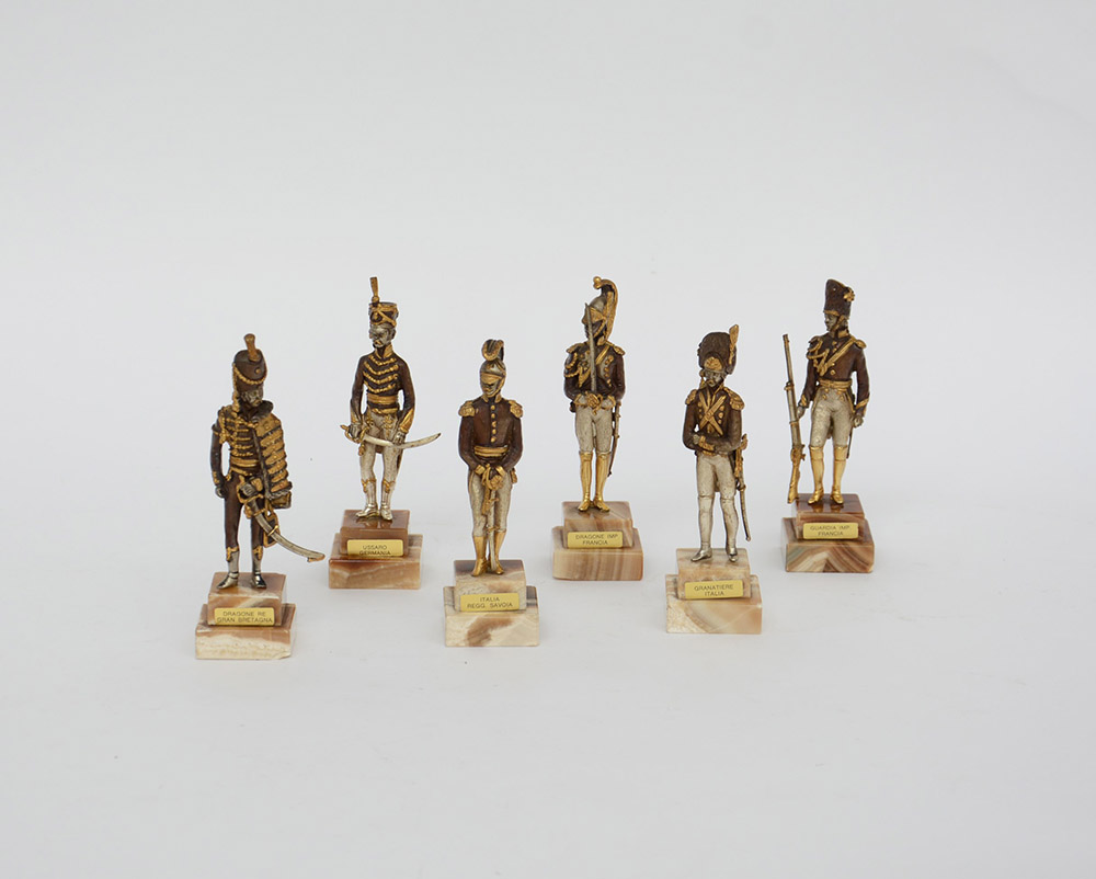 Giuseppe Vasari 1934 2005 Lotto composto da sei soldatini in metallo su basi (h cm 11 circa) con i relativi attestati di autenticità. (Difetti)