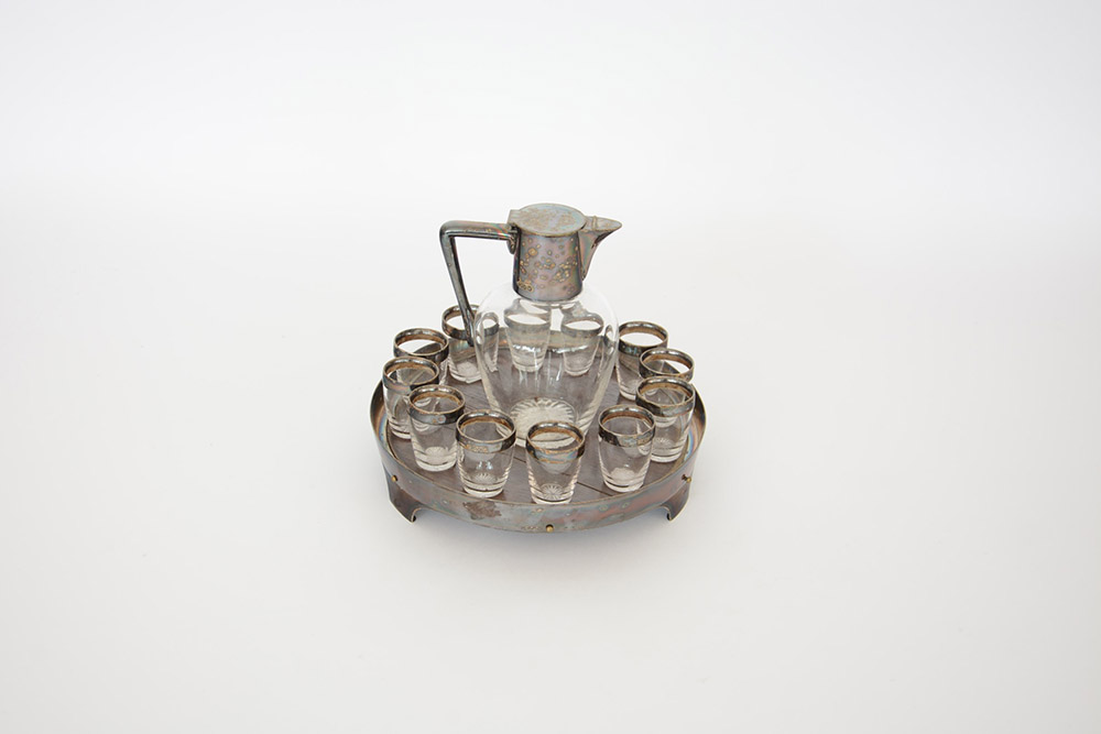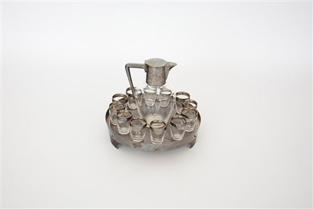 Servizio da rosolio in vetro e legno con ghiere in argento composto da vassoietto, brocca e dodici bicchierini