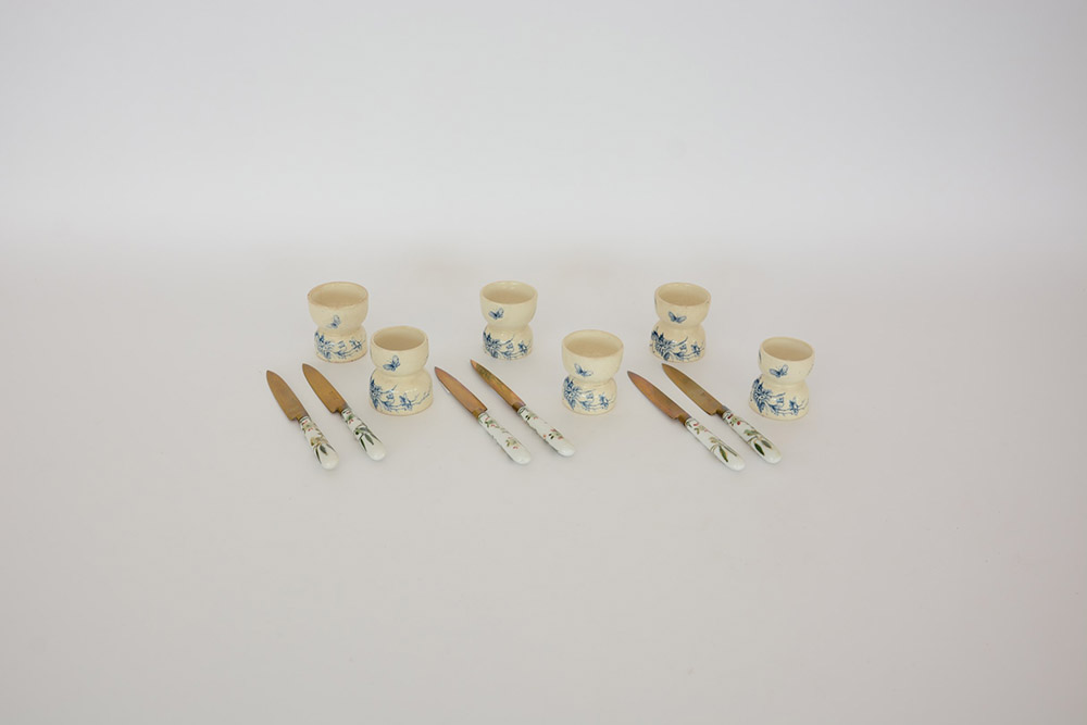 Manifatture diverse. Lotto composto da sei coltellini in ceramica e metallo e sei portauova in ceramica (difetti)