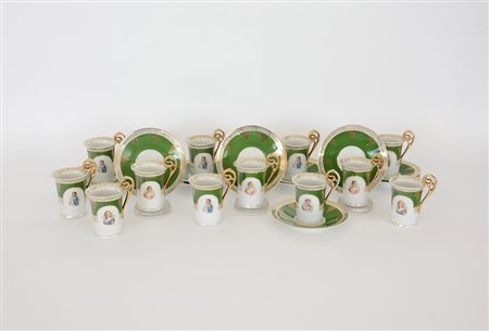 Dodici tazzine da caffè in porcellana con loro piattino in stile Impero. Fondo bianco e verde oliva con decorazione a medaglioni a decalcomania raffiguranti busto di Napoleone o busto di dame. Bordi dorati e motivo a greca in oro a stampo. Manico a voluta dorato. Un piattino rotto. Usure all’oro. Marca di fabbrica: quadrifoglio e lettere A.G. a stampo in rosso. Numerali incussi. Turingia, Limbach (?), XIX/XX secolo