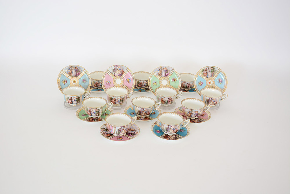 Dodici tazzine da caffè in porcellana con loro piattino. Decorazione policroma a quartieri profilati da greca vegetale stilizzata in oro a stampo intervallata da scene a fiori e a soggetto mitologico a decalcomania. Manici a doppia voluta. Tre tazzine ed un piattino sbeccati; un piattino rotto e incollato. Marca di fabbrica: scudo di Vienna. Fabbrica tedesca o austriaca, XIX/XX secolo