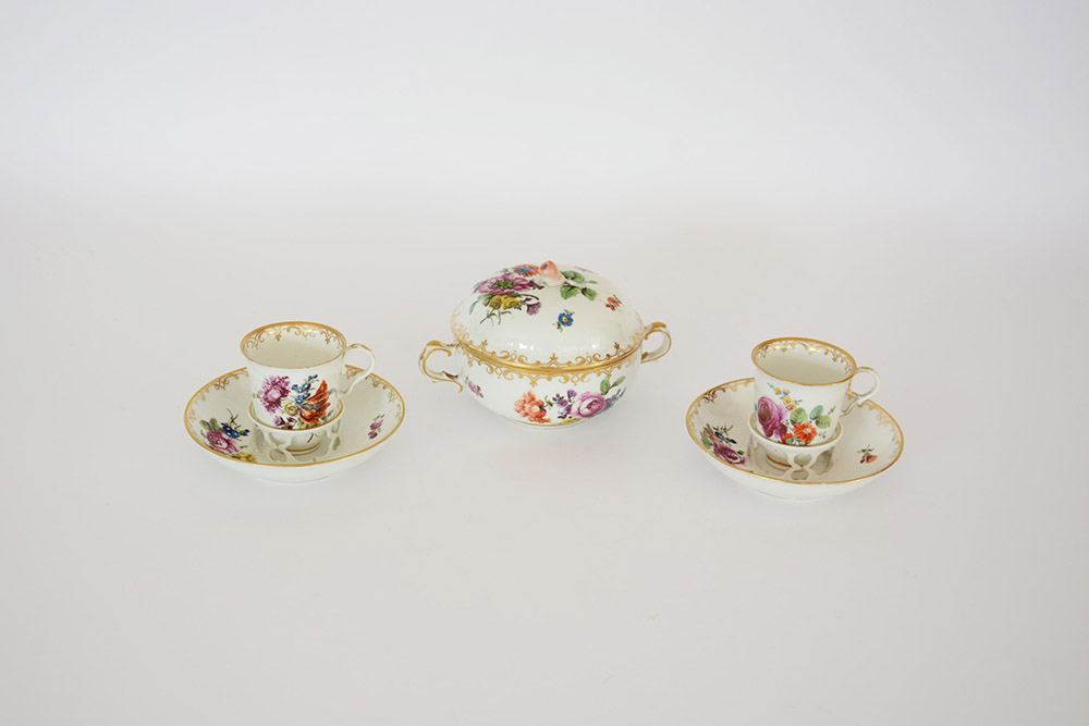 Coppia di tazzine trembleuse da caffè ed ecuelle/tazza da brodo con coperchio in porcellana con decoro policromo a fiori. Profili dorati e pizzetti ornamentali in oro. Manici a voluta. Marca di fabbrica: scudo di Vienna. Fabbrica tedesca o austriaca, seconda metà del XIX secolo.