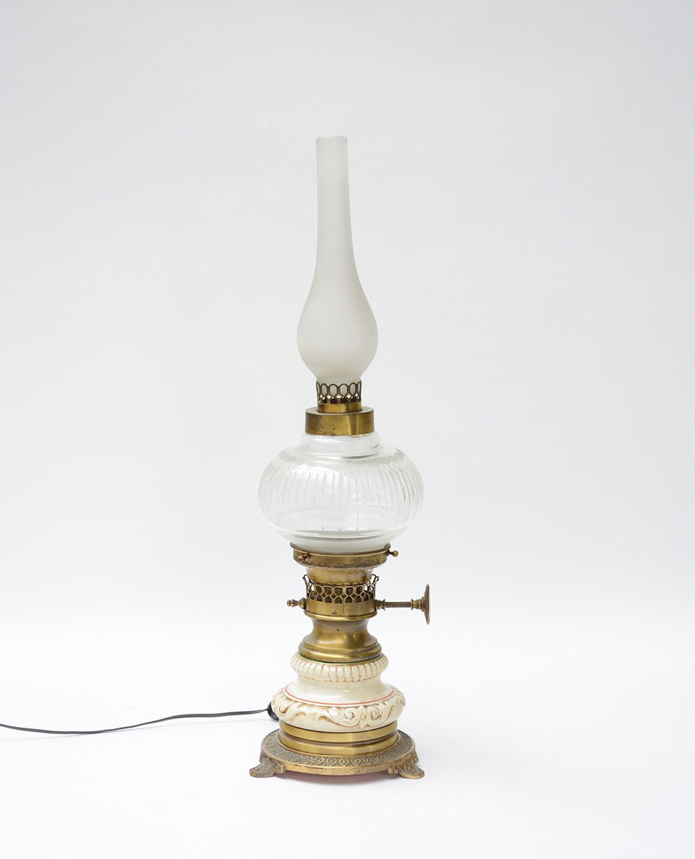 Lampada a petrolio montata a luce elettrica in ceramica e metallo (h cm 62 (difetti)