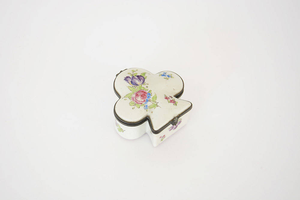 Piccola scatola/tabacchiera in porcellana a forma di trifoglio con cerniera...