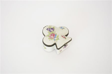 Piccola scatola/tabacchiera in porcellana a forma di trifoglio con cerniera in bronzo dorato. Decorazione a fiori policromi. Difetti alla cerniera ed usure. Mennecy, seconda metà del XVIII secolo