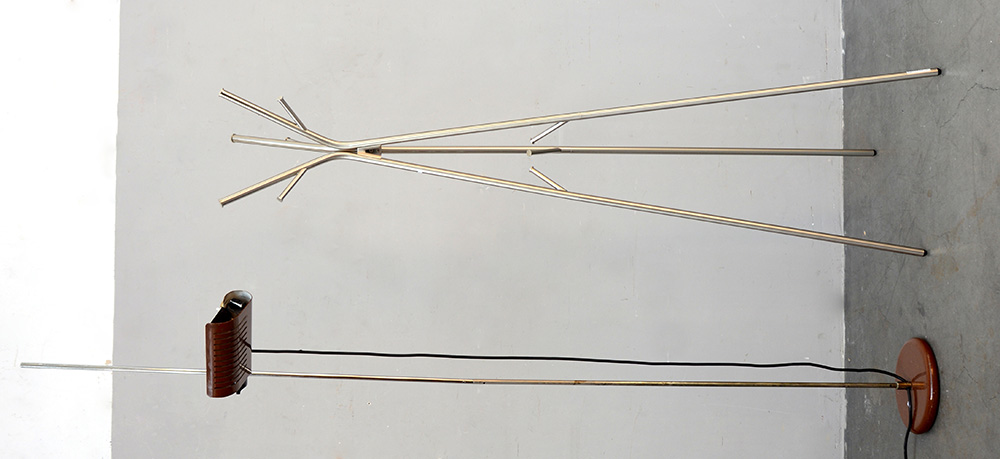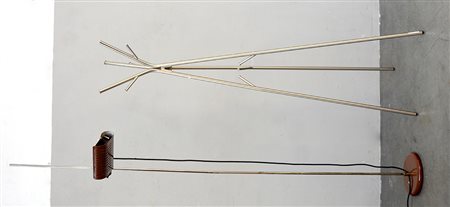Lampada da terra modello "626" con base e paralume in metallo laccato marrone e struttura cromata. Produzione O-Luce, anni 70. Unita a un appendino in metallo (misure diverse) (difetti) G. Gramigna, Repertorio del design italiano 1950-2000 per l'arredamento domestico, vol I, Allemandi, Torino 2003, p. 184