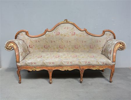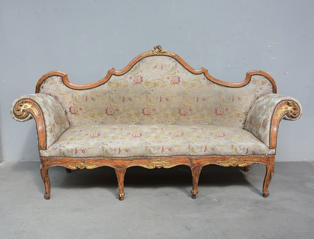 Antico divano con struttura in legno tinto a finta radica e volute dorate; dorsale mosso e braccioli aggettati; rivestimento in tessuto operato (difetti)
