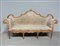 Antico divano con struttura in legno tinto a finta radica e volute dorate;...