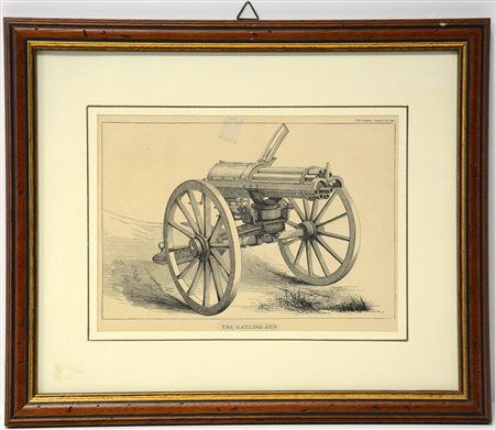 Litografia (cm 16x23) raffigurante la mitragliatrice Gatling, datata 20...