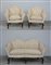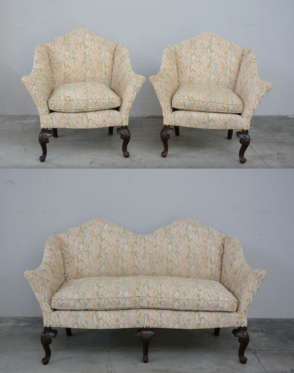 Fornitura da salotto con schienale e braccioli sagomati, gambe anteriori intagliate. Composto da divano a due posti e due poltrone. Rivestiti in tessuto a fiori. Veneto, sec. XVIII