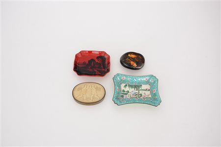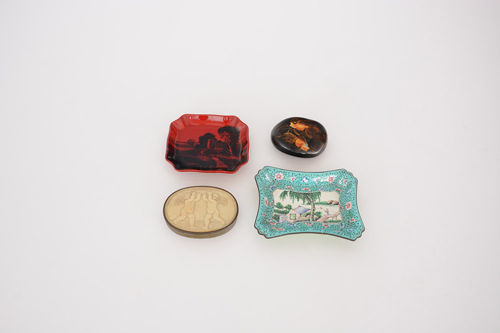 Lotto composto da due piattini in ceramica e metallo cloissonè, un sasso dipinto e una tabacchiera decorata a putti (difetti)
