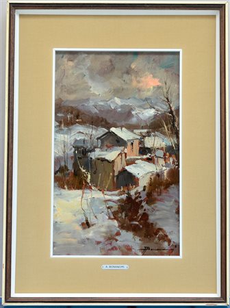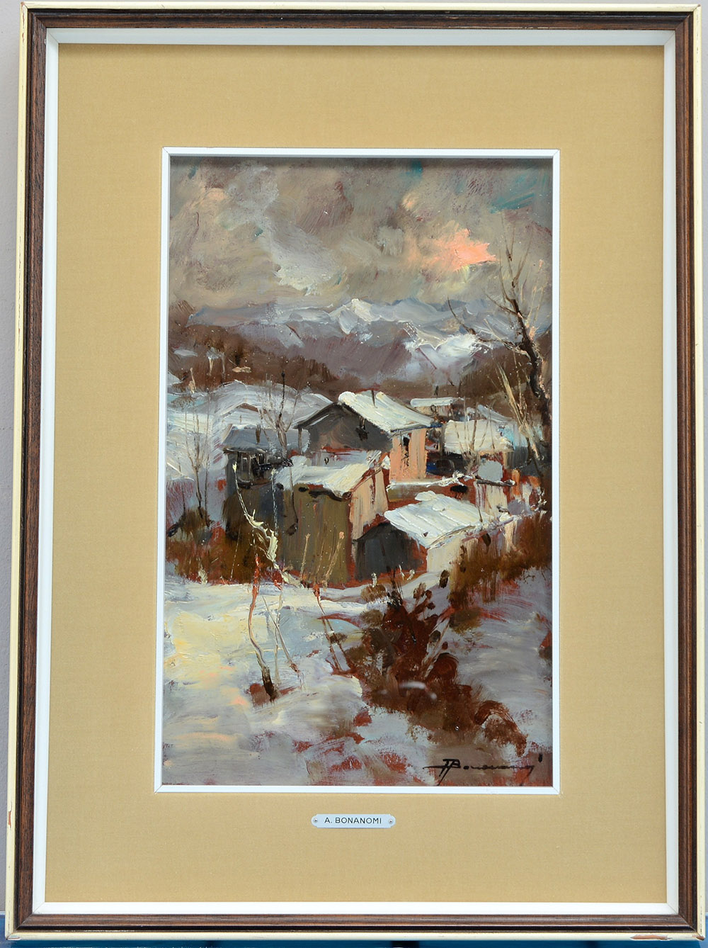 Bonanomi A. "Neve in Piemonte" olio su masonite (cm 40x25,2) firmato in basso a destra, intitolato al retro. In cornice.