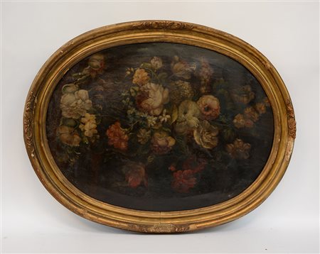Ignoto "Composizione floreale" olio su tela ovale (cm 66x88) In cornice in legno dorato (difetti e piccolo strappo alla tela)