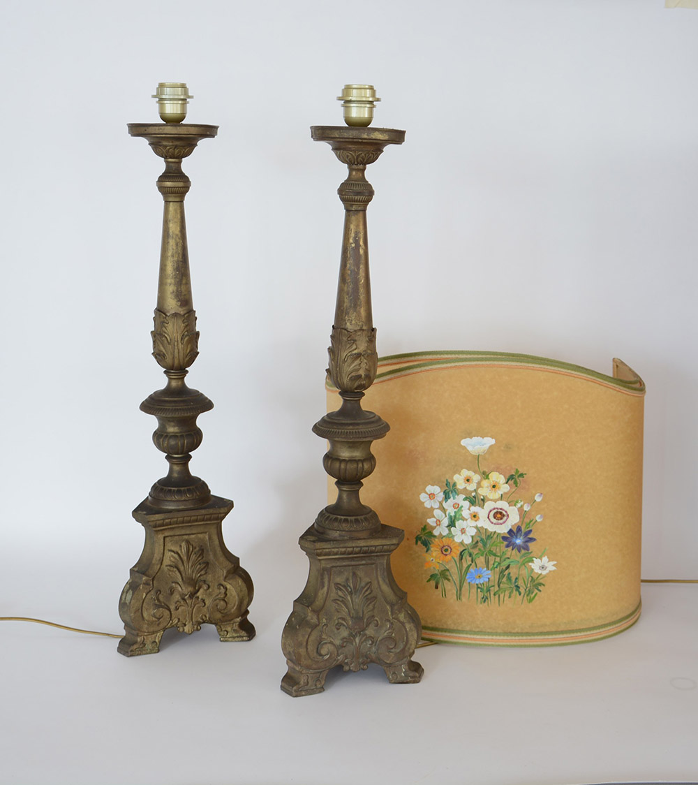 Coppia di portacandele rivestite in rame dorato e sbalzato a foglie. Sec. XVIII (h. cm 74) Montate a luce elettrica in epoca posteriore
