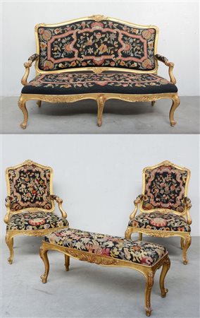 Fornitura da salotto in legno intagliato e dorato, composta da divano, due poltrone e sgabello, rivestita in tessuto a piccolo punto a fiori e frutti