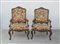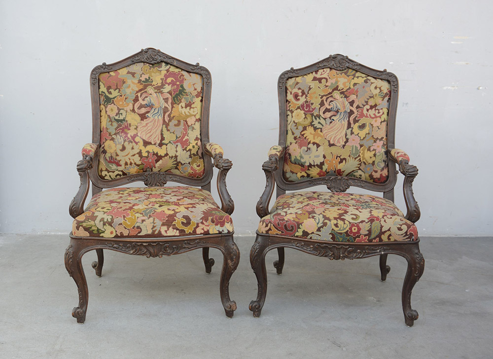 Coppia di poltrone con schienale sagomato e intagliato motivi vegetali. Braccioli e gambe mosse. Rivestite in tessuto a piccolo punto a fiori e figure femminili