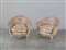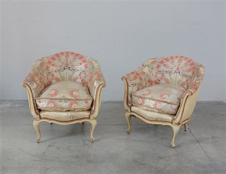 Coppia di poltroncine a pozzetto in legno intagliato, laccato e dorato rivestite con tessuto a fiori (difetti)