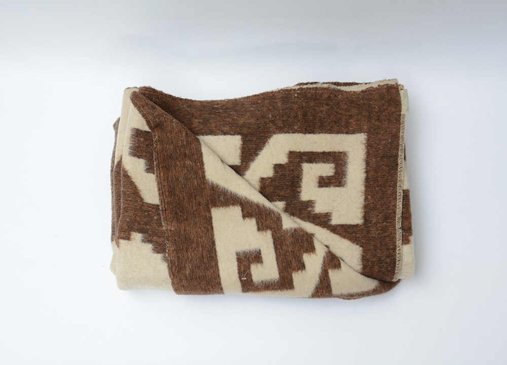 Plaid in lana naturale marrone e bianca decorato con motivo inca su fondo...