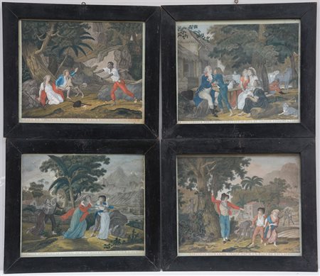 Gruppo di quattro incisioni francesi a colori del sec. XIX (cm 34x40) In cornici in legno ebanizzato (difetti)