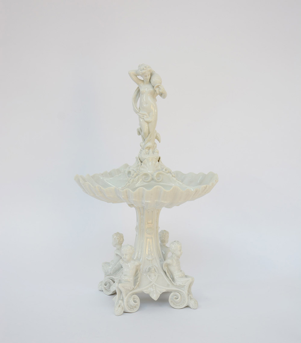 Centrotavola in ceramica decorato a figure e putti in rilievo (h. cm 48) (difetti)